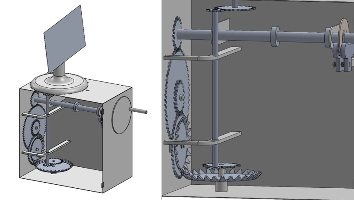 Even though I wasn't the happiest with my groups decision to go for a unique design instead of a realistic design, I choose to take on the hardest part which was figuring out the physics of the gear train and designing it. Which I ended up having to put countless hours into, I had to go into more advanced physics than I was used to. The most relevant thing I had to do was research and study all the physics of a brake, in order to slow down the falling weight enough to turn this gear train, while being heavy enough to produce enough torque in the end. I slowly found that this was possible but only for a day or two. The brake pads would wear too fast and would need constant adjustment, which went against one of the key criteria we needed to meet which was on a day, the farmers needed to spend less than 60 seconds to get it going.